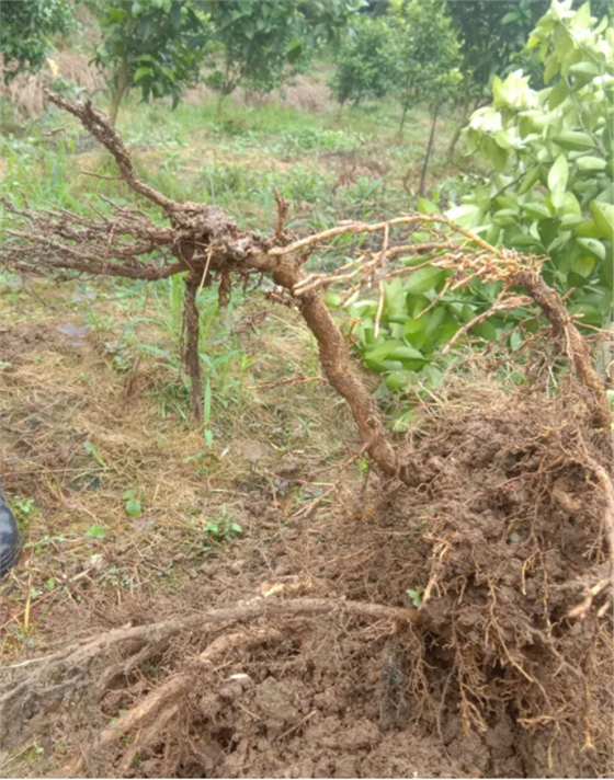 根結(jié)線蟲為害柑橘根部,特別是側(cè)根、須根,造成根尖部位形成根瘤,根毛稀少,大小形狀不等,細(xì)根或側(cè)根明顯減少,初期根瘤為乳白色,后轉(zhuǎn)變成黑褐色;嚴(yán)重的時(shí)候須根扭曲并形成團(tuán)餅狀,最后壞死。